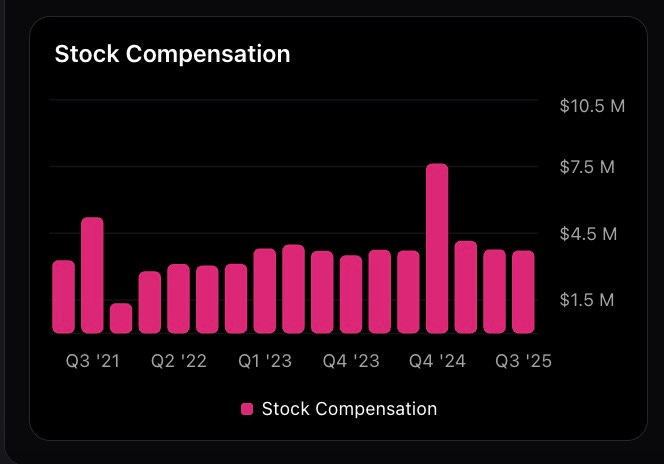 The company incurred $11.7M in stock-based compensation on $51.2M in revenue (9 months). This means ~23 cents of every dollar of revenue is effectively paid out in equity to employees. While this preserves cash, it is a significant dilution driver that is excluded from “Adjusted EBITDA” metrics often used by analysts.