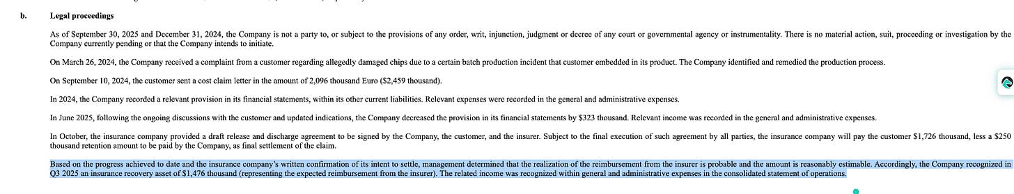In Q3 2025, the General and Administrative (G&A) expenses were unusually low ($2.2M vs $5.8M in Q3 2024). Note 5 reveals this was due to an insurance recovery asset of $1.476M recognized regarding a customer claim. This is a non-recurring event that artificially made the Q3 operating loss look significantly better than it actually was operationally