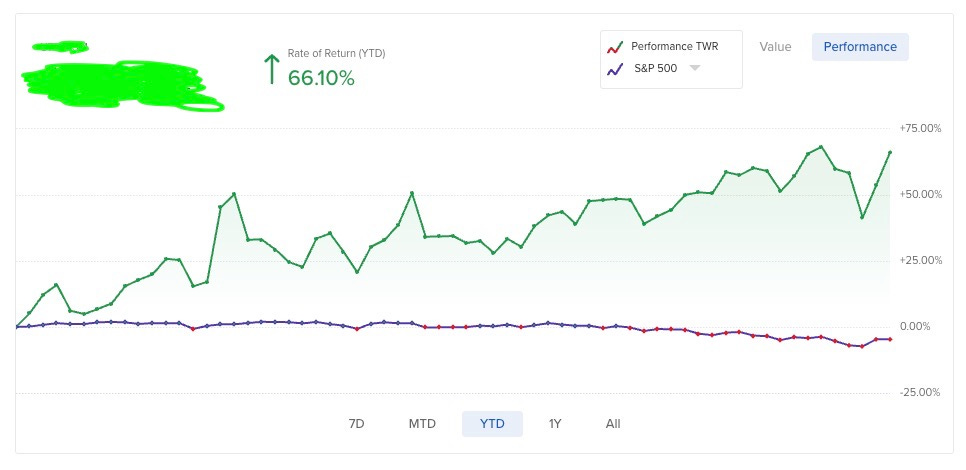 I rarely talk about my performance because it’s easy to fake and hard to calibrate how much risk someone took to receive those returns. In one of my folio it stands at 66% YTD. The other broker doesn’t allow me to take screenshot like these.