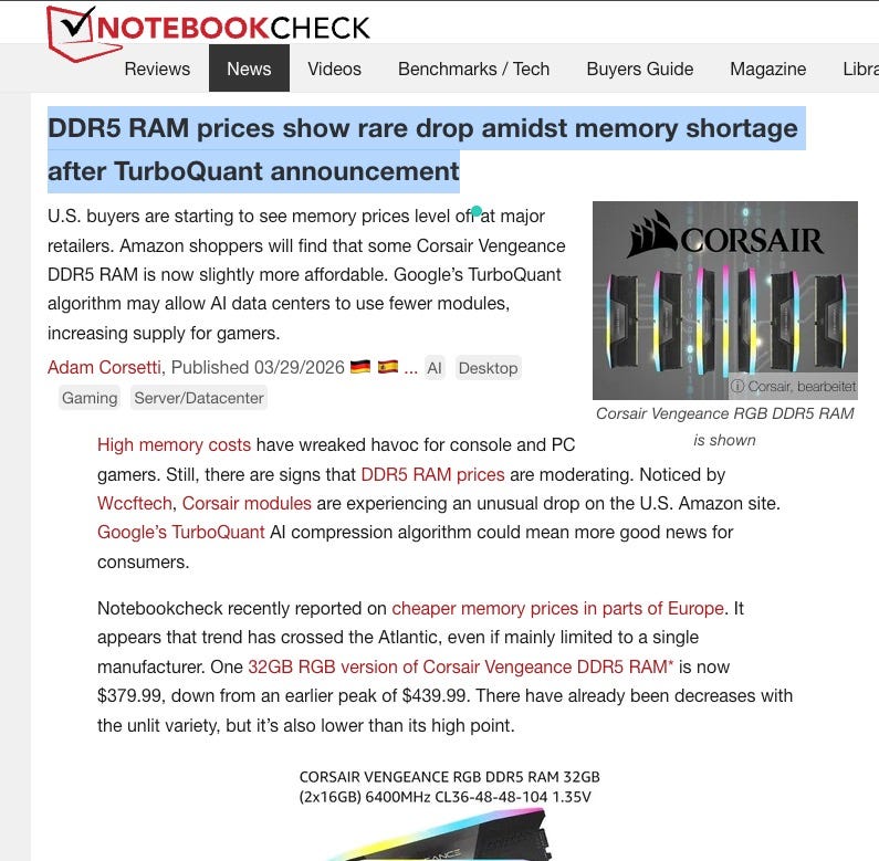 There are plenty of X posts talking about how turboquant is a year old innovation and how it is not going to relieve the pressure on tight Memory supply