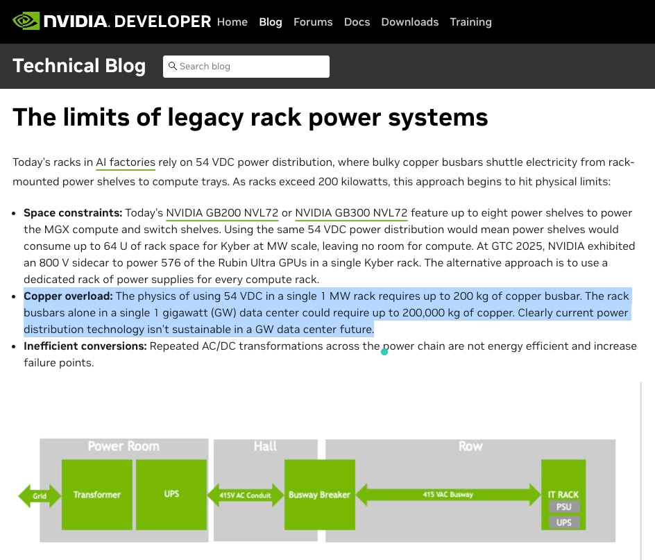 NVIDIA’s own whitepaper claims ~45% less copper in an 800 V plant.