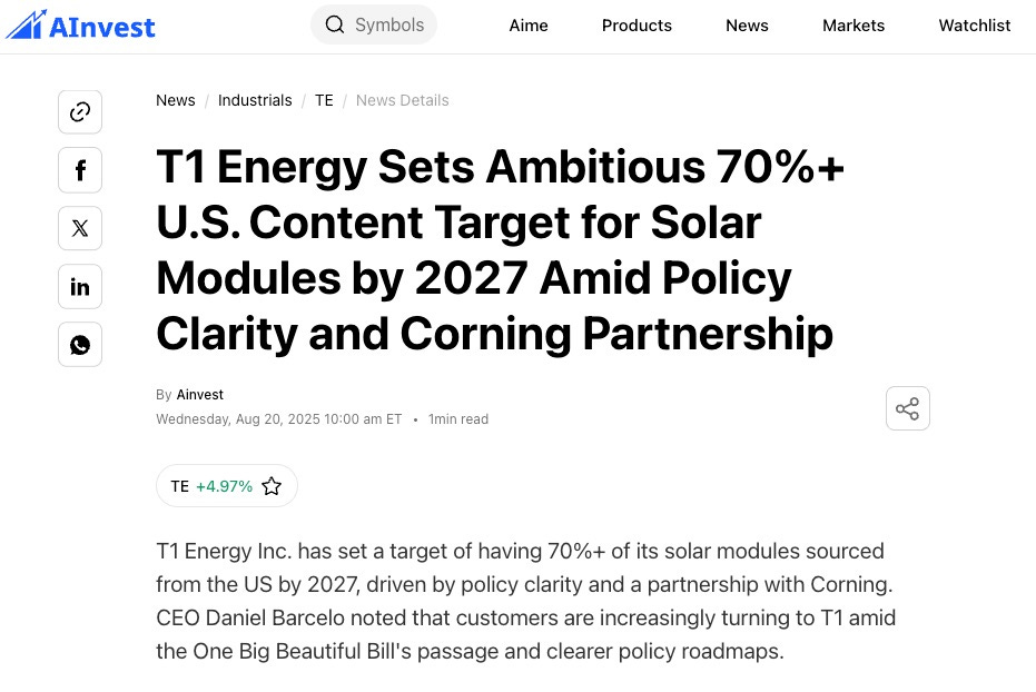 - T1 Energy CEO Daniel Barcelo in Nov 2025 explicitly stated: