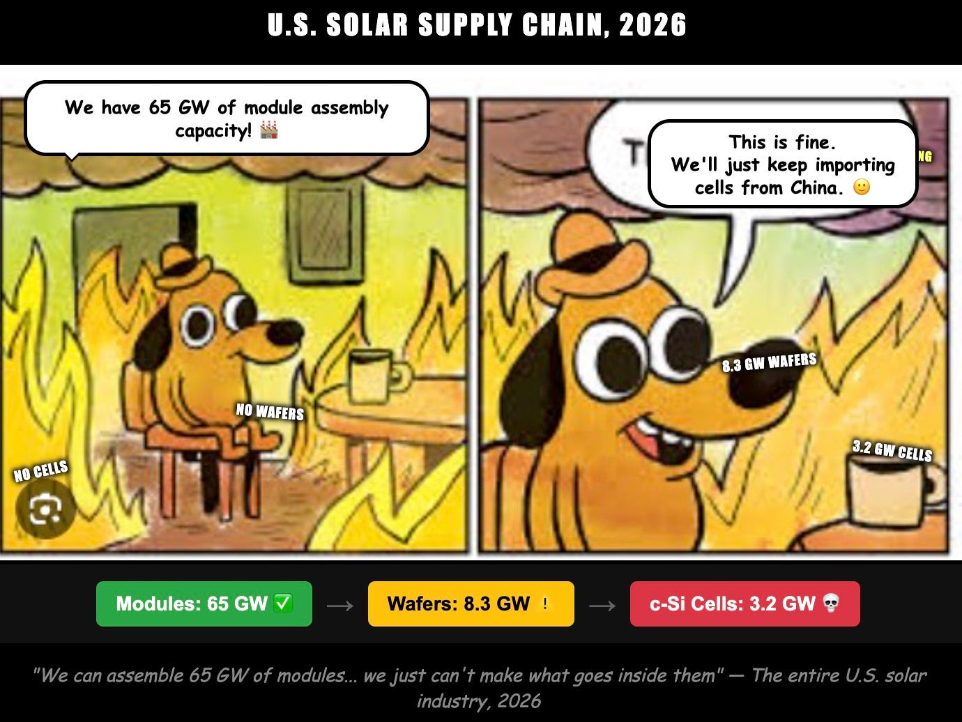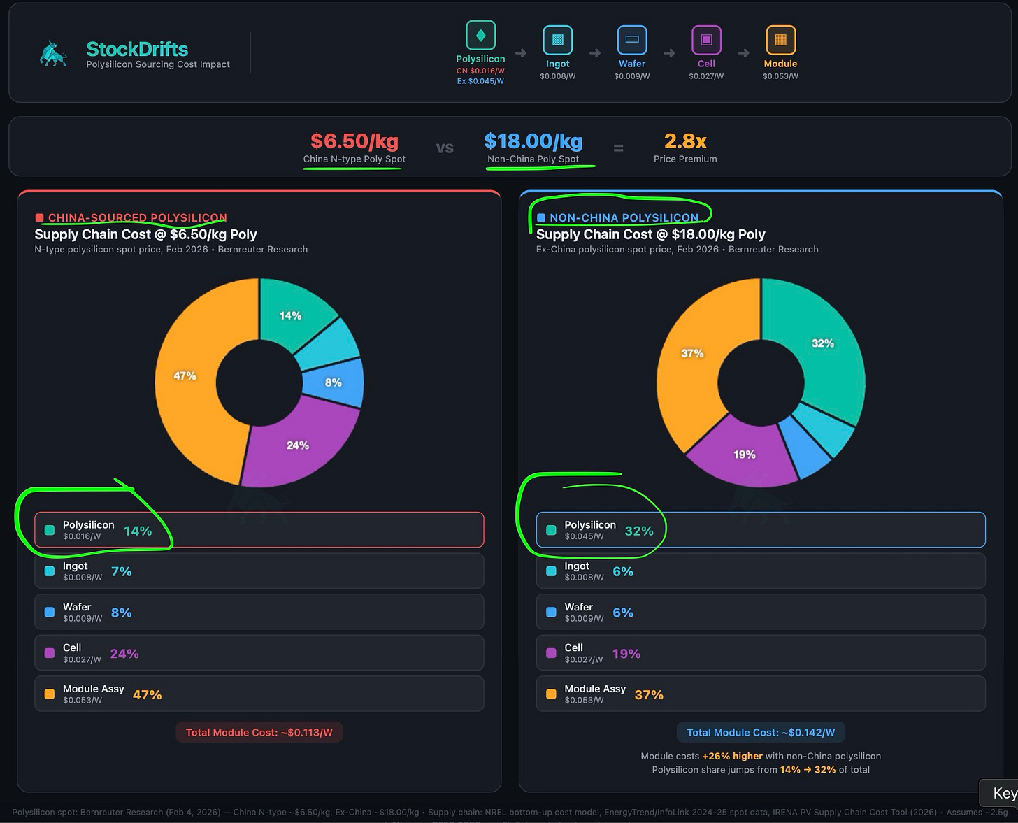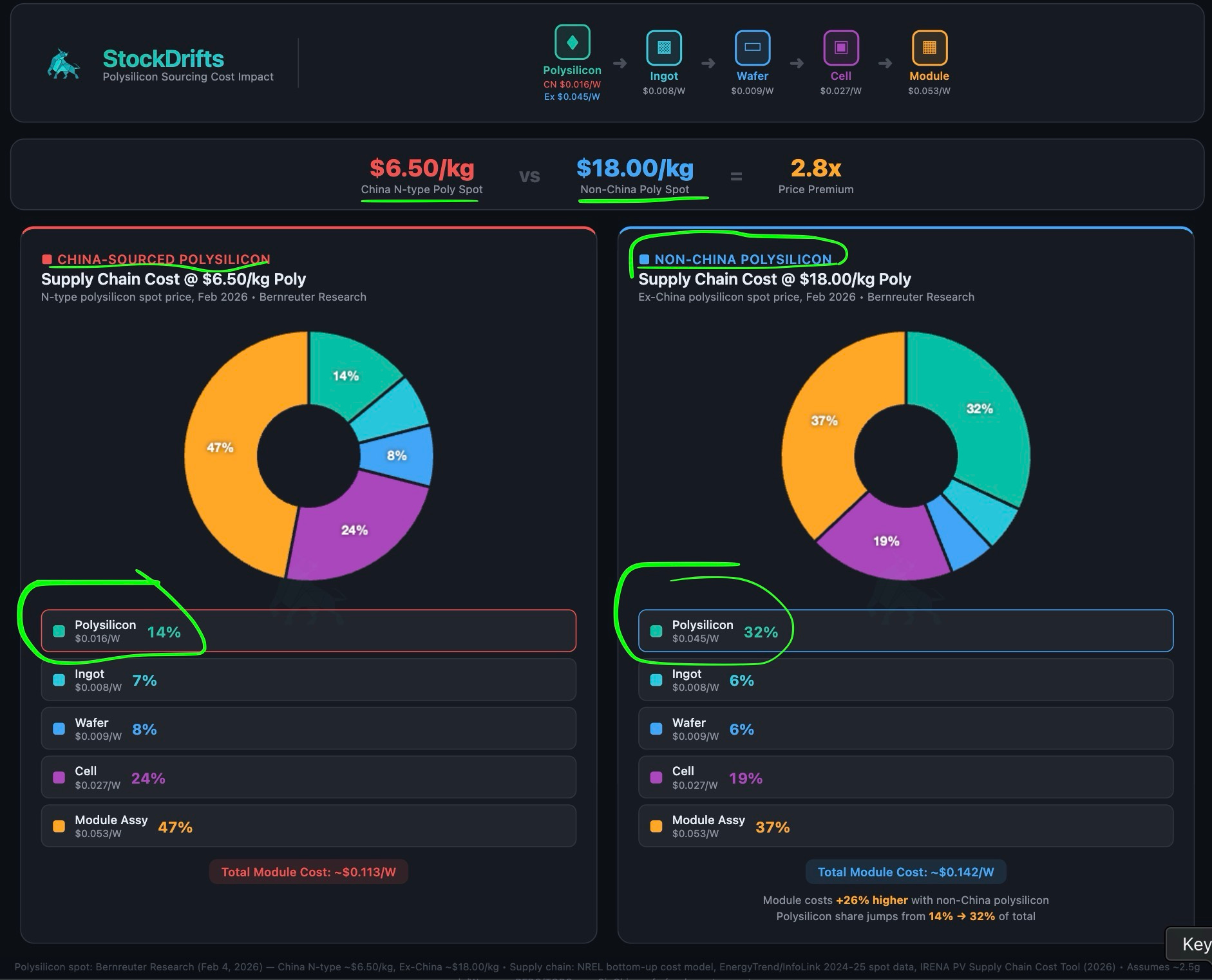 The real issue is that the 45X Credit: $3/kg only and the gap between Western polysilicon and Chinese is around 12$. So that really is a big gap. Pure, US supply chain is going to come at a short term cost. Not to mention there is simply no capacity for Polysilicon in the US
