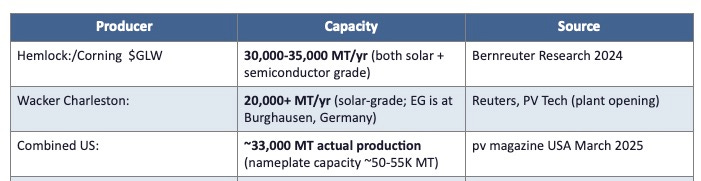 Combined US nameplate: ~50-55K MT/yr. Actual production ~33K MT. If all of that was converted into Solar cells it would be equivalent to ~13-16 GW of solar modules.